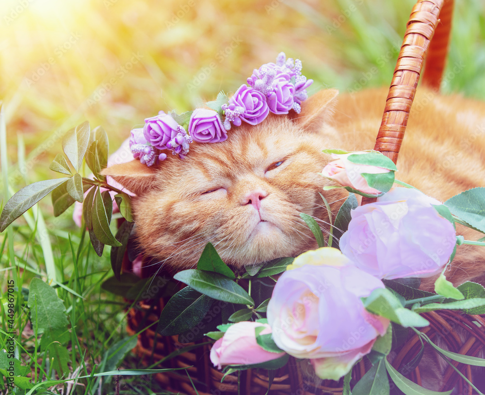 Cute ginger British shorthair cat wearing a floral crown lying in a basket in the garden