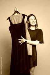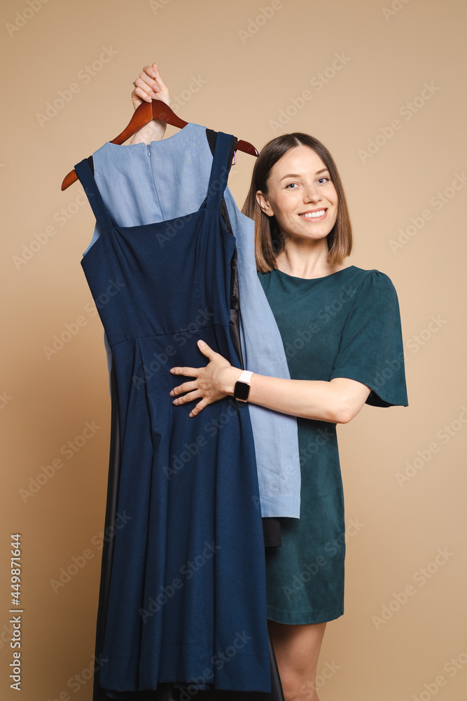 Charming dark blond caucasian woman in green dress smiles widely and holds hanger with dresses dress, trying to decide what to wear.