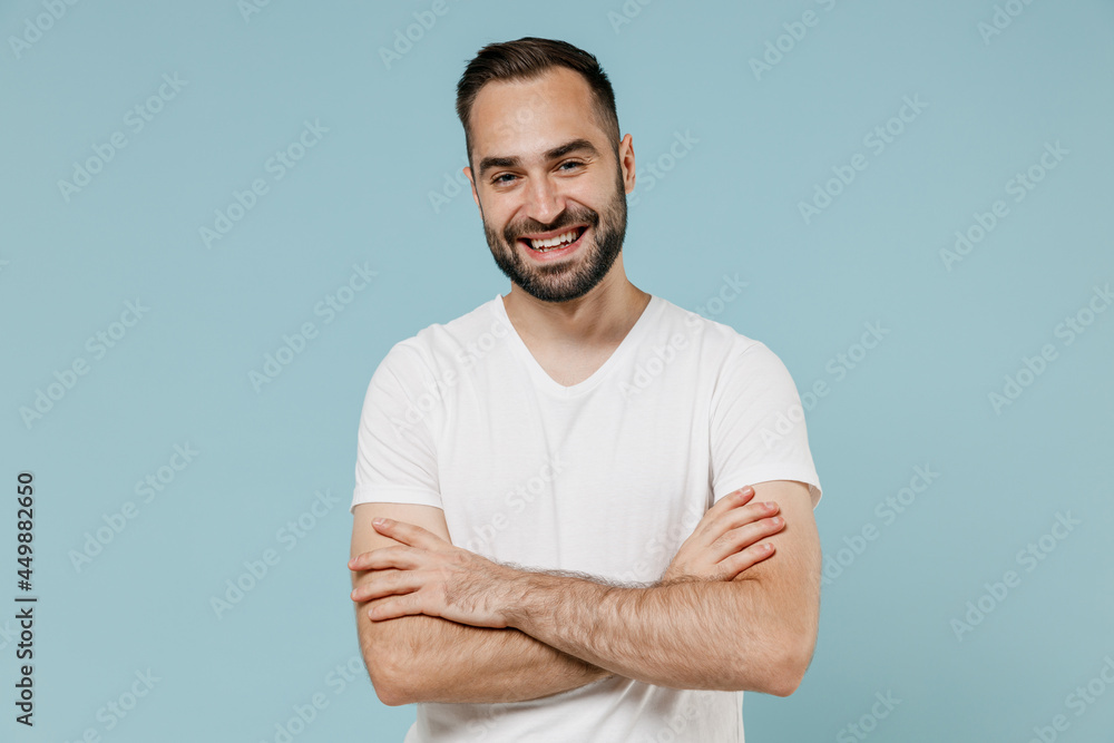 Young fun smiling happy man 20s wearing casual white t-shirt looking camera hold hands crossed folded isolated on plain pastel light blue color background studio portrait. People lifestyle concept