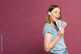 Photo of a surprised excited young girl isolated over pink background holding money make winner gesture.