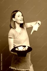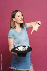 Picture of excited young cheerful woman standing over pink background holding a hat with money. Looking camera pointing to dollars
