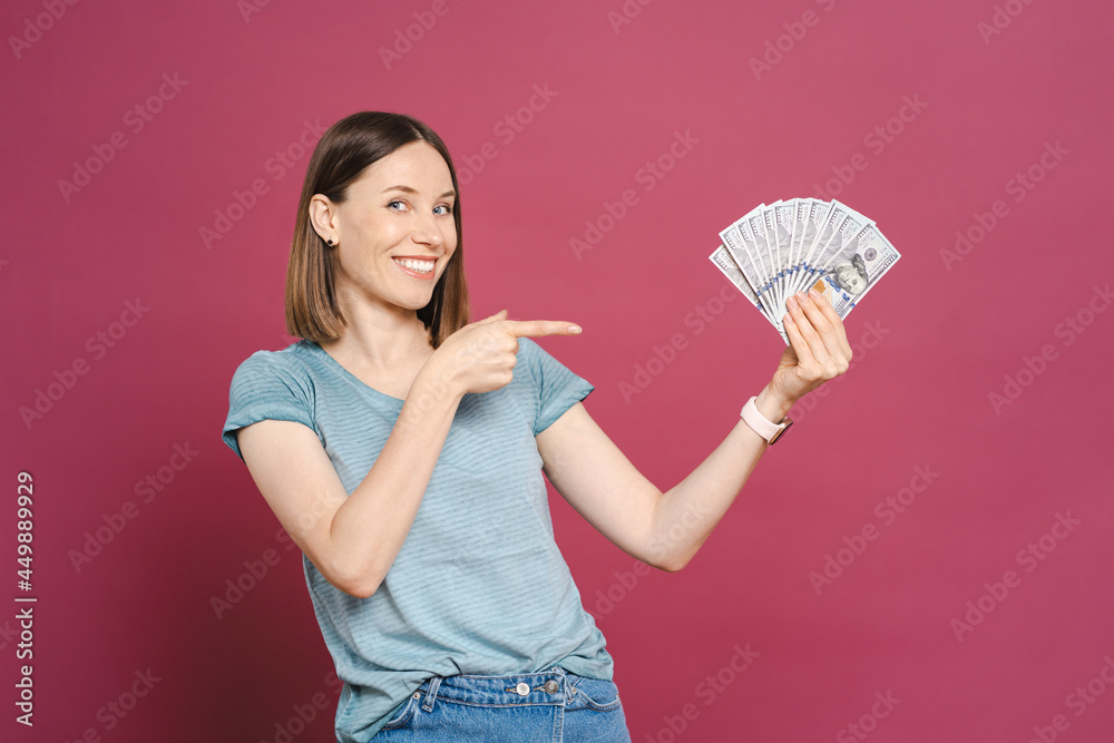 Picture of excited young cheerful woman standing over pink background holding money. Looking camera pointing to dollars