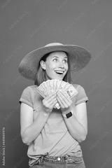 An image of a joyful young lady in a blue summer t shirt and big hat is holding money happily on pink background