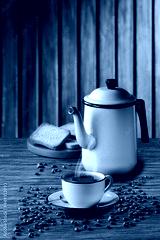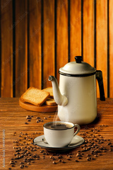 Mesa de madeira com xícara de café e bule rústico com grãos de café espalhados ao redor e torradas ao fundo