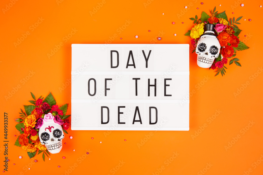 Lightbox with Day of the dead text on orange background. Dia De Los Muertos Celebration. Sugar Skull, calaverita, marigolds flowers. Traditional Mexican culture festival flyer. Flat lay, top view.