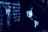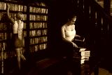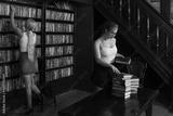 Two young librarians in the classical library room.