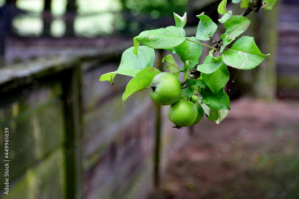 A close up on a bunch of green fresh Polish apples hanging from a branch of a deciduous tree full of leaves seen in the middle of a local orchard next to a wooden fence made out of planks and boards
