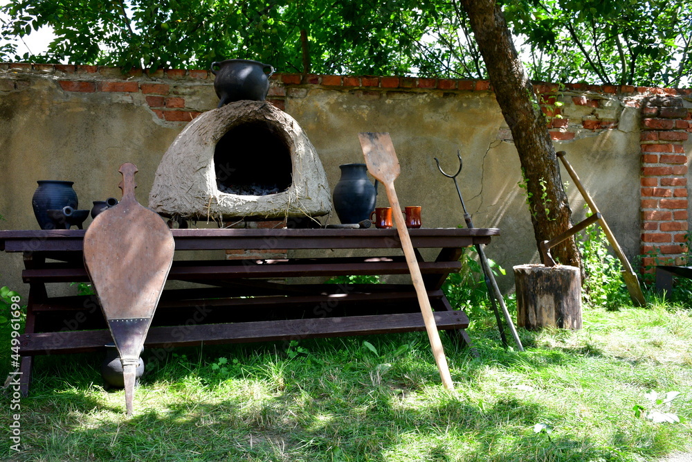 A view of a small oven made out of clay and concrete surrounded with pots, vases, bowls, ladles and other medieval kitchen utensils standing on a wooden table in the middle of a small garden in Poland