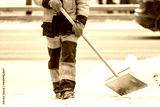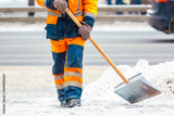 Communal services worker sweeps snow from road in winter, Cleaning city streets and roads after snow storm. Moscow, Russia.