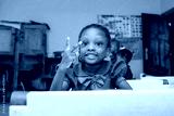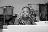 African girl child making happy gestures with fingers, wearing a purple school uniform while sitting at a desk and studying in a classroom for excellence in her education