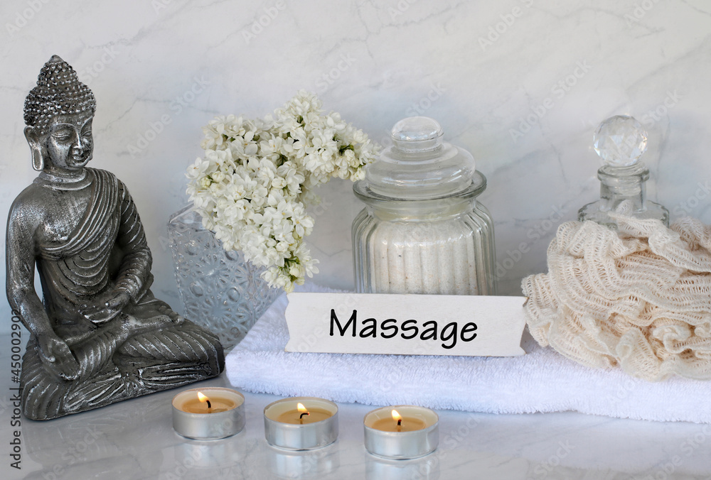 Spa Komposition: Buddha mit Kerzen und Flieder.
