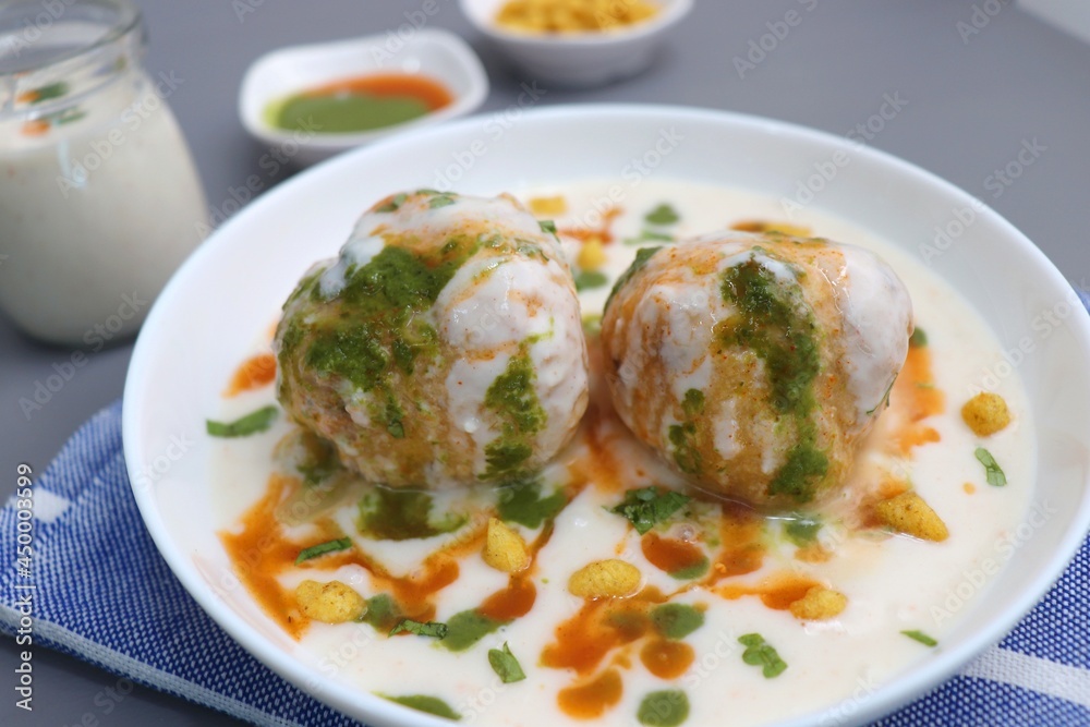 Dahi Bhalla or Dahi Vada is a type of chaat dish from India. It is prepared by soaking urad dal vadas in creamy yogurt with green and red chutney. Tri color dish. Indian Tiranga Flag colors food.