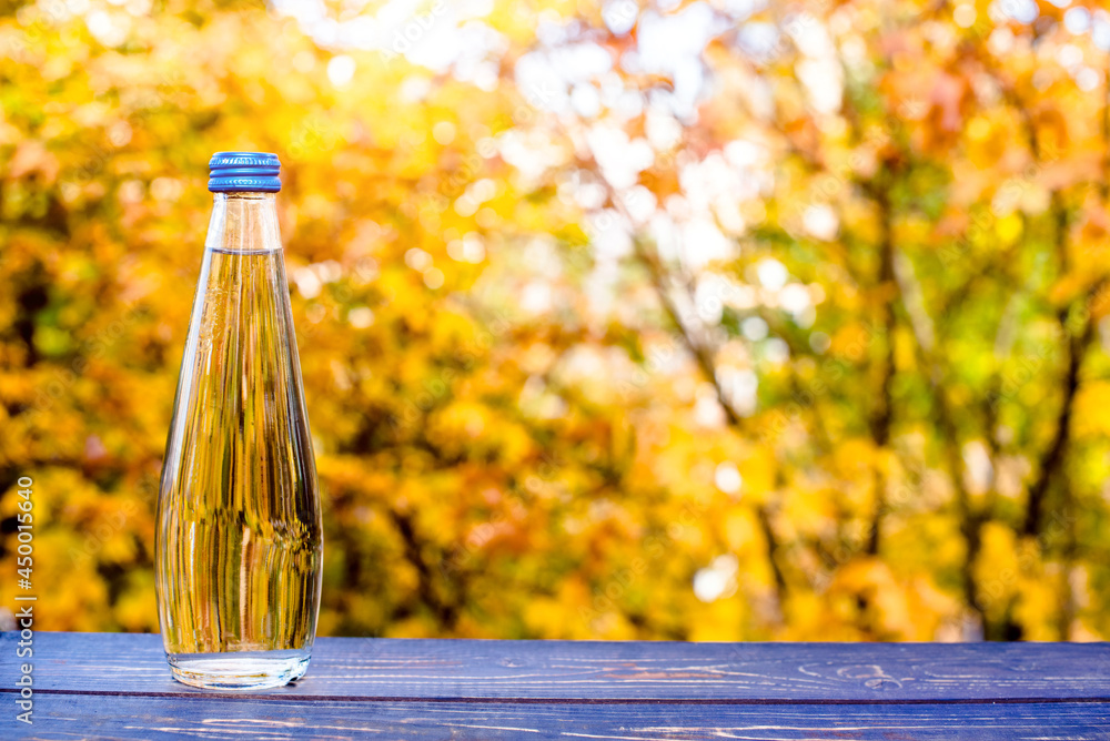 A bottle of drinking water stands on a background of yellow autumn leaves