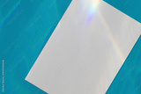 Close up of empty white vertical rectangle a4 poster or business card mockup, lying diagonally with overlay of rainbow light refraction caustic effect and shadow on trendy blue concrete background