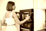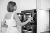 Woman heating food with microwave machine at home, female using modern kitchen appliances