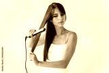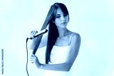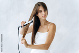 Adorable young woman straightening her hair with a flat iron and looking aside with calm emotions. White wall at the background. Woman hair concept