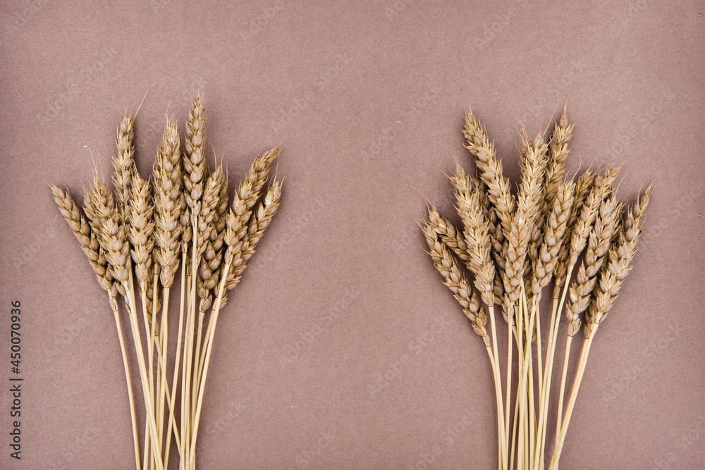Two bunch of spikelets of wheat on brown background. Flat lay.
