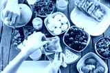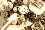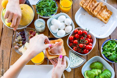 Breakfast on the terrace top view. Family eating breakfast at the table top view.Fried eggs in a skillet on a large table filled with food.Fried eggs in a skillet for breakfast for a large family.Lots