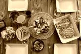 Dinner on the table top view. Grilled salmon for dinner with salad. Dinner for a large company on the terrace, top view. Healthy food on the table. Salad with cheese and olives. Beautiful dinner