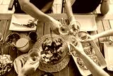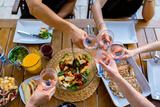 Celebration with glasses. Christmas. New Year at the table. Festive table. Celebration with the family. Breakfast. Dinner with friends and family. Dinner. Holiday dinner. Friends are resting. Friends
