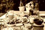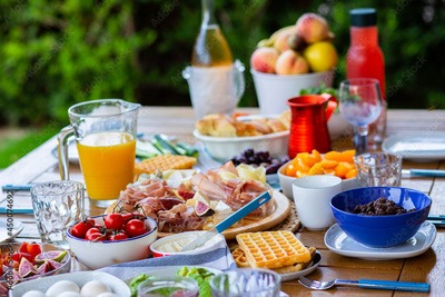 Laid table with food.Breakfast on the terrace.A table with food for a large family.A party.Banquet.Dinner on the summer terrace.Birthday on the street.Dining table with food.Lots of food on the table.