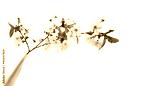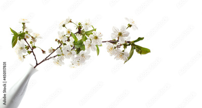 Blooming branch of apple tree with white flowers in vase on light horizontal long background.