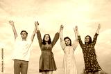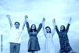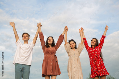 handsome young men with their hands up