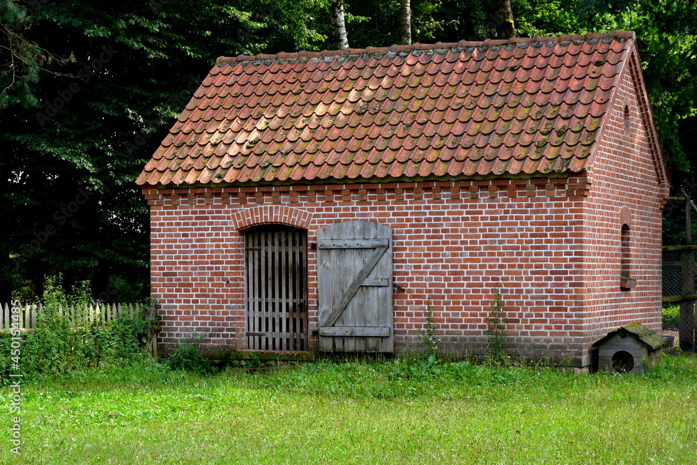 A close up on a barn, pen, or shelter made out of red bricks, tiles, and wooden elements standing in the middle of a well maintained lawn with a small dog house to the side seen on a sunny summer day