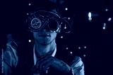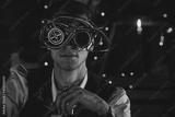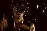 portrait of a male engineer in cyberpunk glasses and a steampunk suit in a workshop