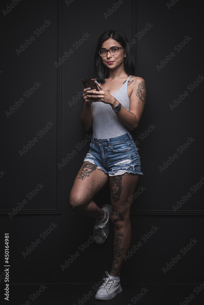 Beautiful tattooed woman with cell phone in her hands on black wall