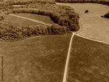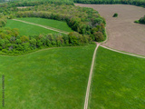 Green spring rural landscape with pasture, bare ground fields, road lines and forest around. Aerial countryside on sunny day