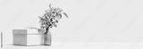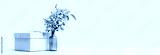 Pink pastel holiday banner with gift box and spring or summer flowers branch in a vase. Monochrome., birthday or wedding Mothers day