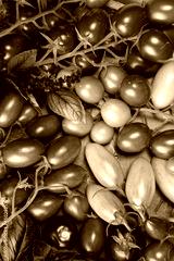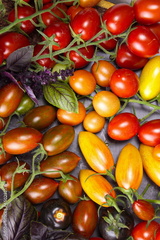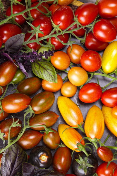 Brush fresh tomatoes of different colors Close-up.Harvest from the farm
