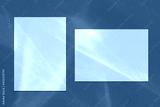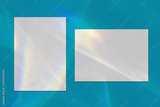 Two empty white vertical and horizontal rectangle a4 poster, business card mockups with overlay of rainbow light refraction caustic effect and shadow on mint blue concrete background