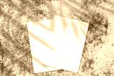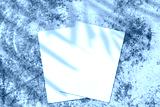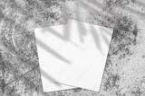 Two empty white rectangle poster or card mockups lying diagonally on top of each other with soft palm tree leaves shadows on neutral light grey concrete wall background. Flat lay, top view
