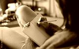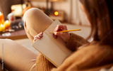 halloween, holidays and leisure concept - close up of young woman with pencil writing to diary and resting her feet on table at cozy home