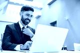 A young man works from home, makes documents, using a laptop straightens his tie.