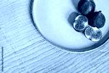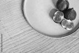 Autumn breakfast in bed composition. Blank greeting card mockup, cup of coffee and fig fruit on ceramic plate. White linen background. Velvet cushions and leather bag. Thanksgiving, fall. Top view.