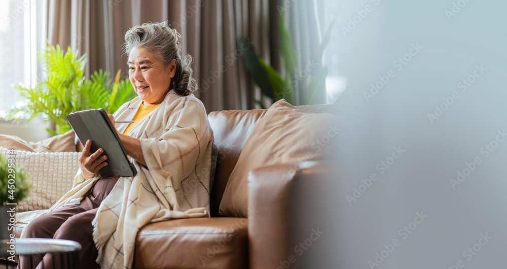 old senior asian grandmother sit casual relax hand use smartphone technology device video call to have greeting and conversation with her family white home isolation quarantine period moment