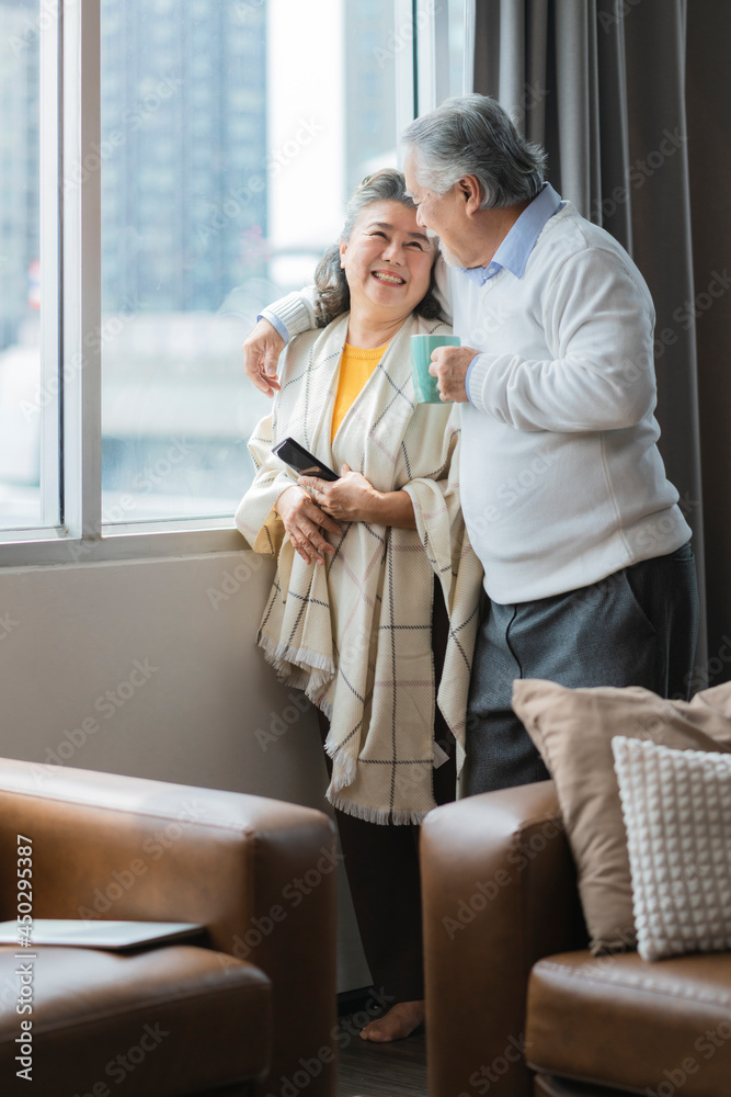 old asian senior couple retired age standing hand hold hot drink look outside window home isolate concept,old senior waiting for lockdown is over home interior background