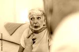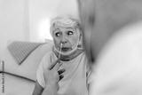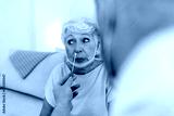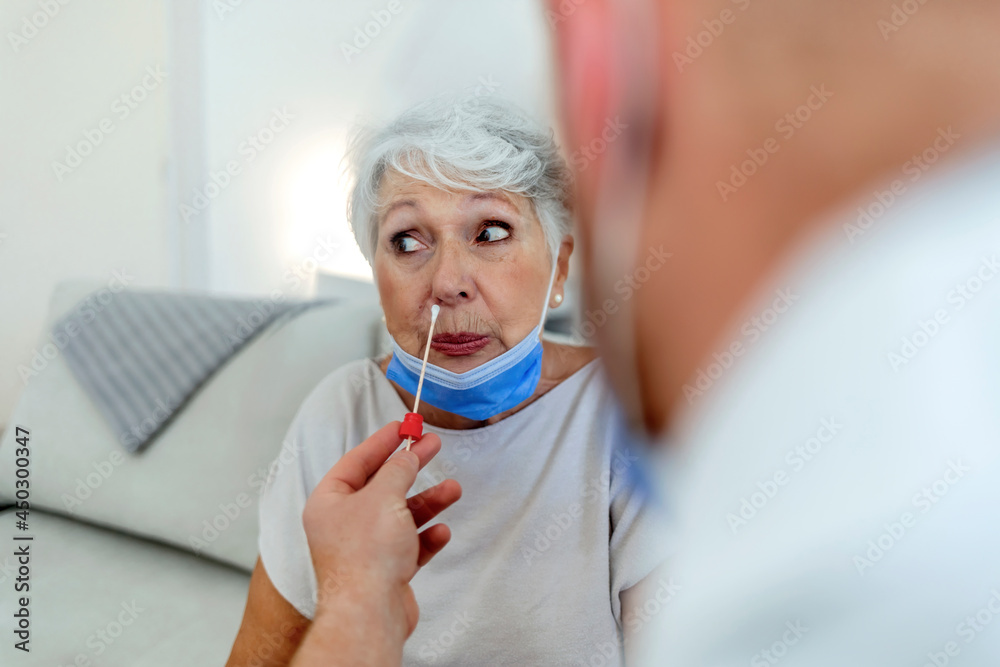 A doctor in a protective suit taking a nasal swab from a person to test for possible coronavirus infection. Male doctor in protective suit taking nose swab test from senior woman. Healthcare concept.