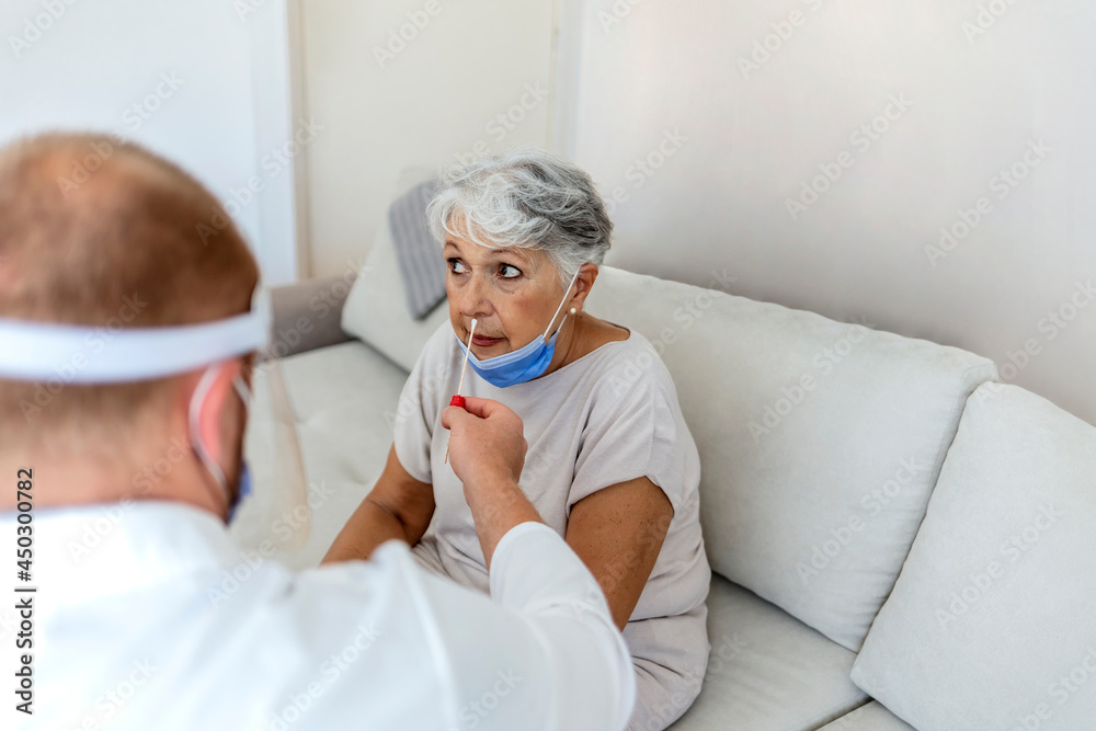 Doctor laboratory assistant takes swab from nose of sick patient at home. Nurse taking coronavirus sample from female patient's nose. Caucasian woman having a nasal swab test done by her male doctor