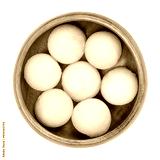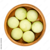 Galia melon balls, in a wooden bowl. Freshly cut out with a melon baller, ready-to-eat pieces of a ripe fruit of Cucumis melo var. reticulatus, a sweet and aromatic melon, also known as sarda. Photo.