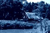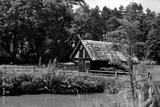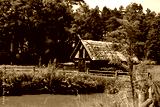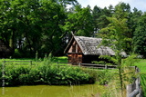 A close up on a wooden shack, hut, or house standing next to a small pond, lake, or swamp covered with shrubs, reeds and other flora seen on a sunny summer day near a dense forest or moor in Poland
