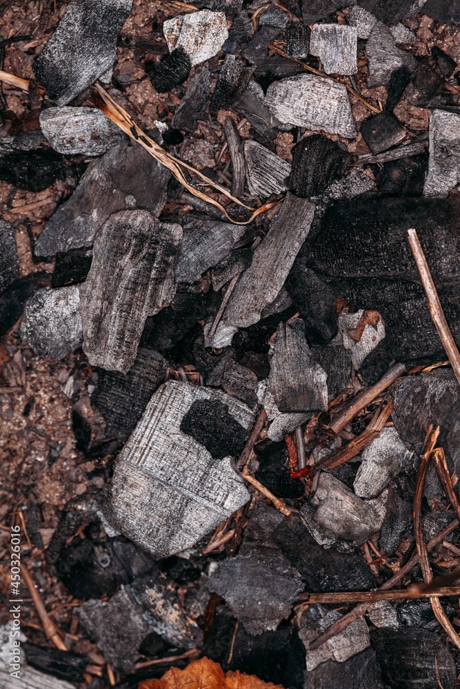 lifeless pine black charcoal on forest floor after forest fire in summer