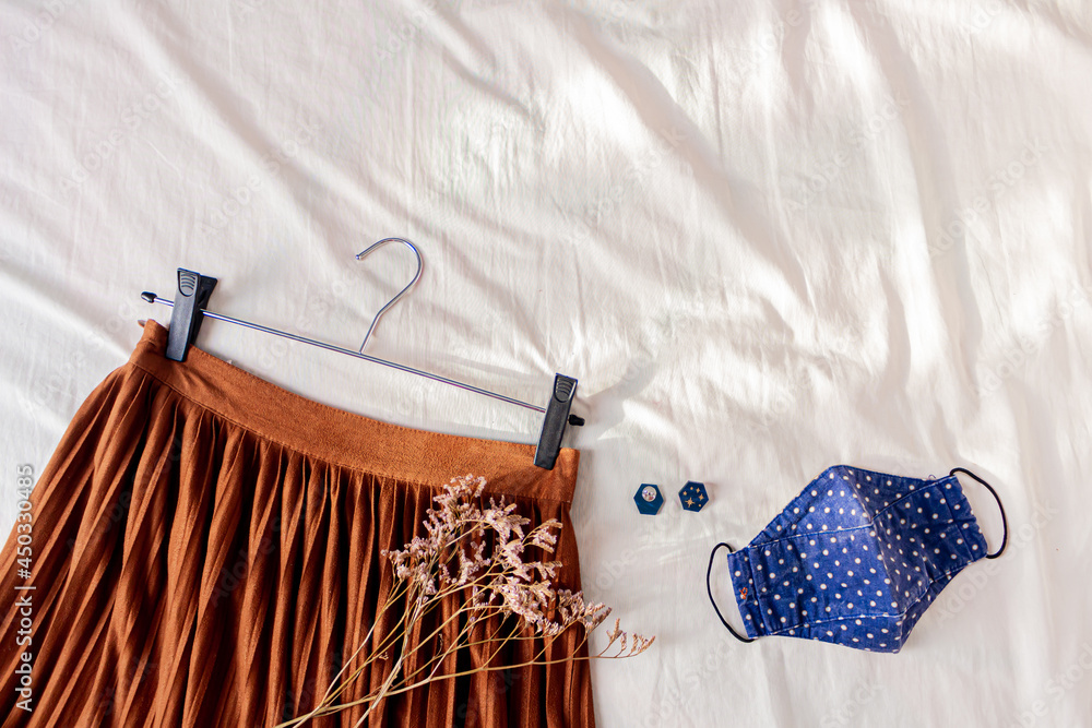 Fashion women's composition with beautiful stylish skirt, earrings and face mask fashion trend on white linen blanket. Flat lay, top view lifestyle concept.