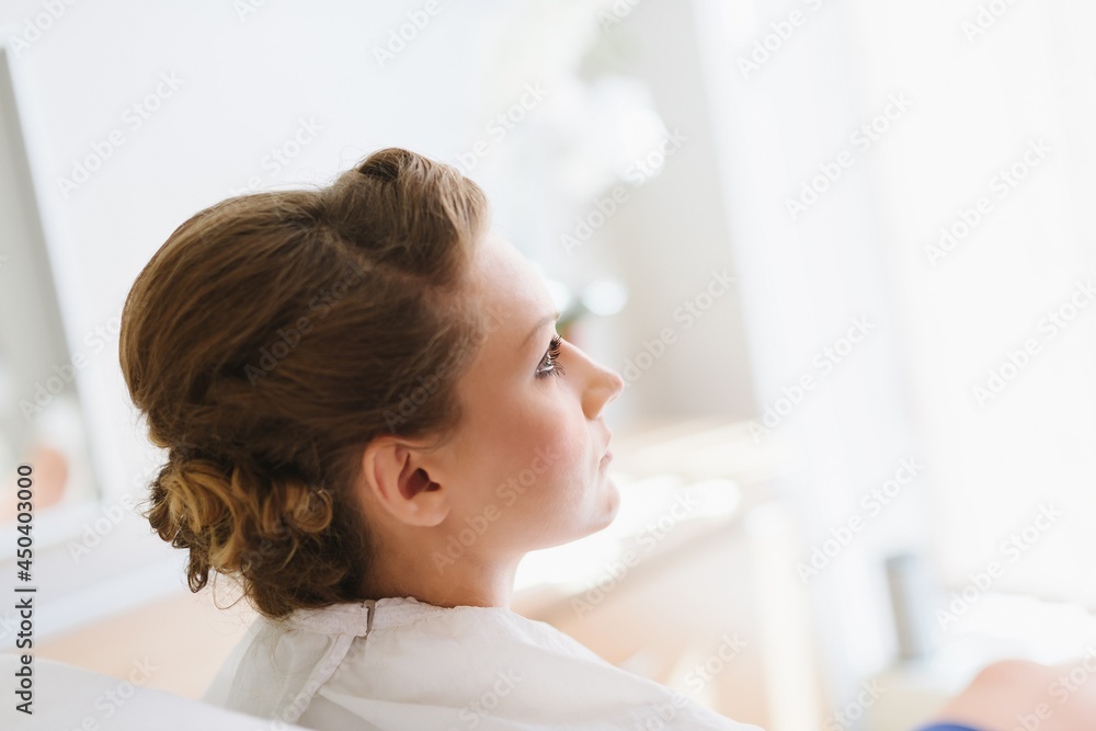 Beautiful bride girl with wedding makeup and hairstyle. Wedding day.