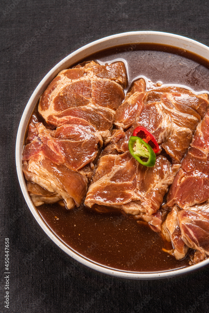 신선한 재료와 간장 양념에 재워서 만든 한국식 돼지 갈비