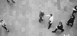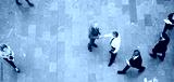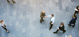 Adult office workers shaking hands in crowded hall