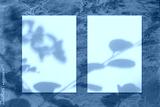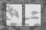 Two empty white vertical rectangle poster or card mockups with soft tree leaves and branches shadows on neutral light grey concrete wall background. Flat lay, top view